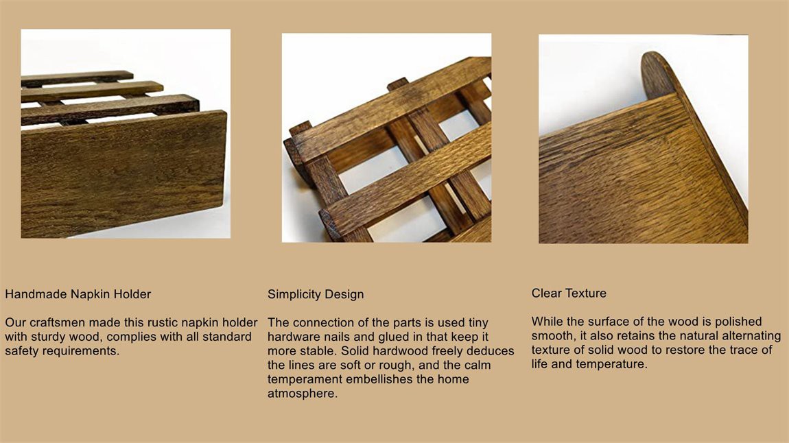 1. Massivholz: Der Serviettenhalter besteht aus natürlichem Massivholz, das chemikalienfrei, umweltfreundlich und einfach zu organisieren ist.